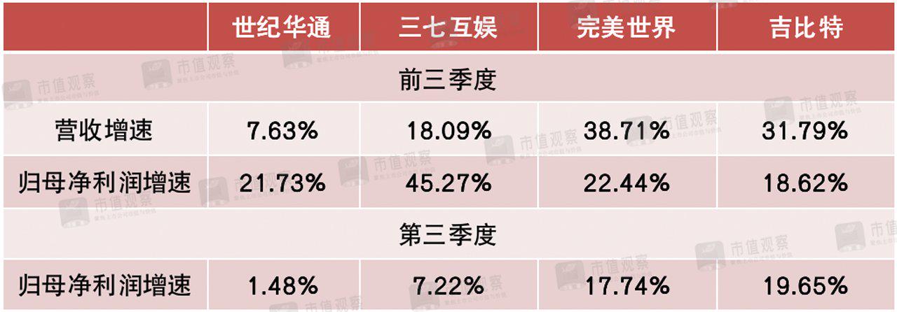 从上表看,世纪华通和三七互娱第三季度归母净利润增速已降至个位数,分别同比增长1.48%和7.22%。完美世界和吉比特第三季度归母净利润尽管维持两位数增速,分别同比增长17.74%和19.65%,但与市场预期仍存在一定差距。