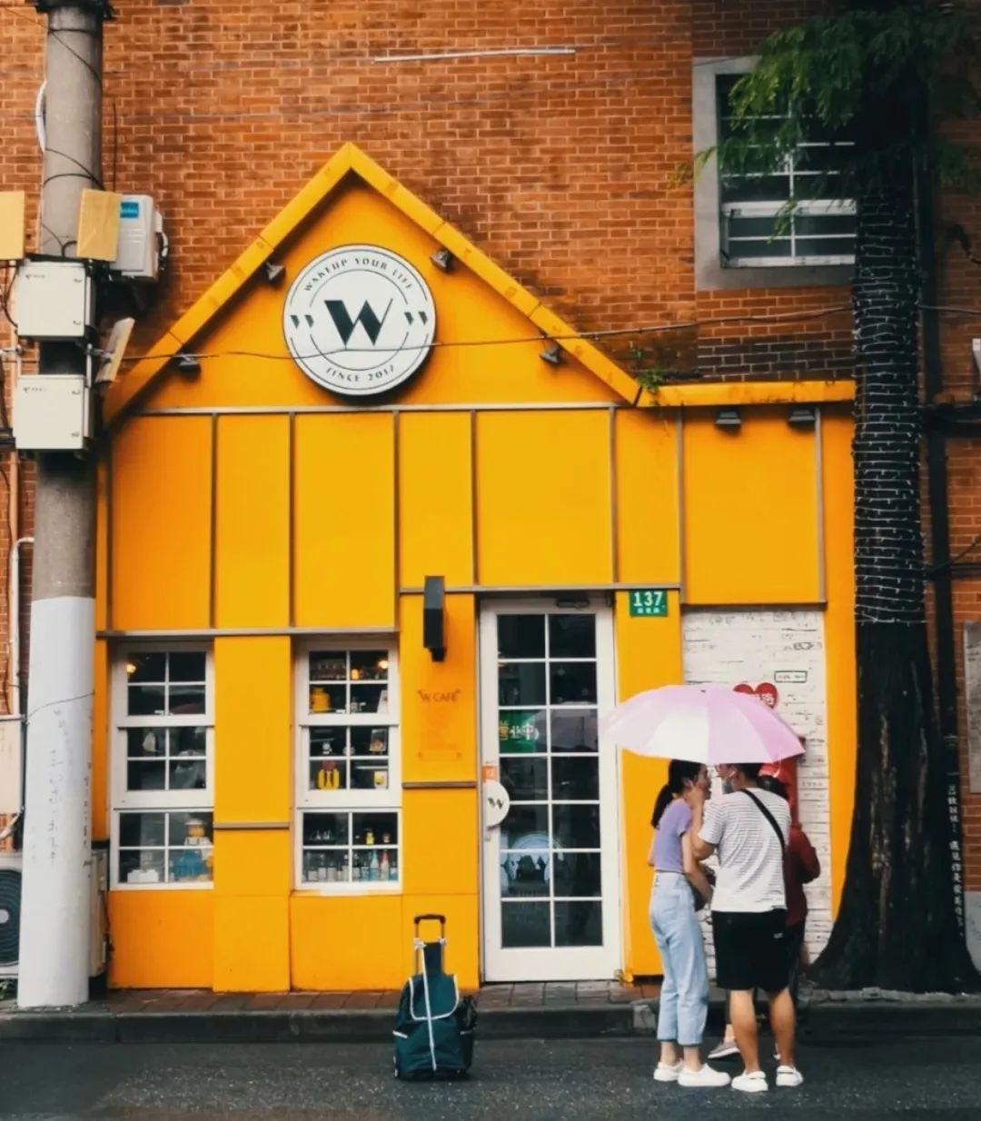 除了门头,还有很多从里到外全部以黄色为风格的门店,比如上海甜爱路的W CAFÉ,黄色成为了到店必拍的打卡点。
