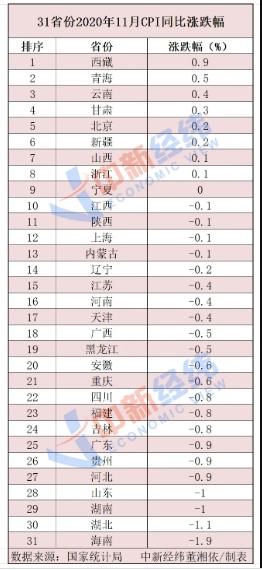 国家统计局11日公布31省份2020年11月居民消费价格指数(CPI),数据显示,22个省份11月CPI同比录得负增长,而海南为跌幅最大的省份,降幅达1.9%。仅8省份CPI同比上涨,西藏涨0.9%领涨全国。
