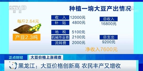 张海龙简单算了个账,自己经营的地,一垧地产大豆约2.3吨,按每斤2.64元,能卖约12000元,加上补贴约4800元,总收入达到16800元,支出方面,地税5100元,机械作业费2100元,流转费2000元,一垧地的净收入约7600元。