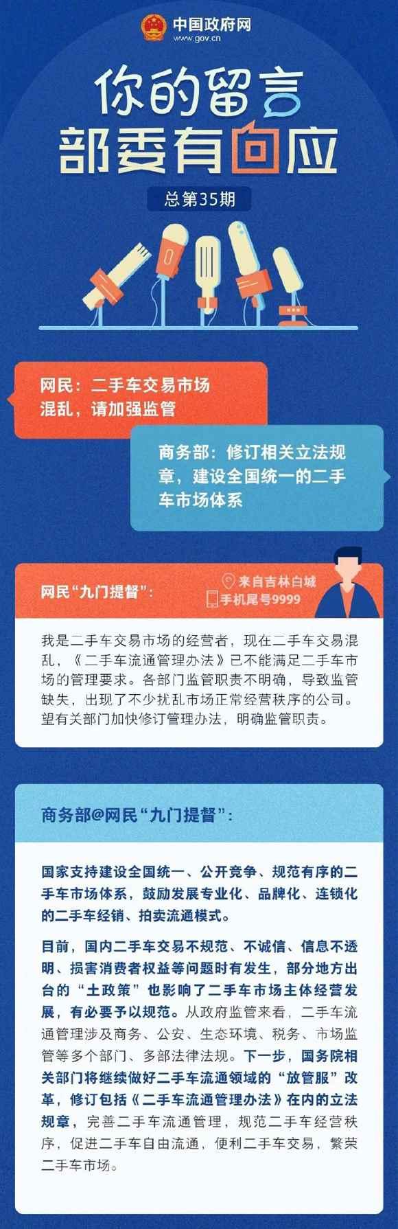 商务部在回复网民时表示,下一步,国务院相关部门将继续做好二手车流通领域的“放管服”改革,修订包括《二手车流通管理办法》在内的立法规章,完善二手车流通管理,繁荣二手车市场。