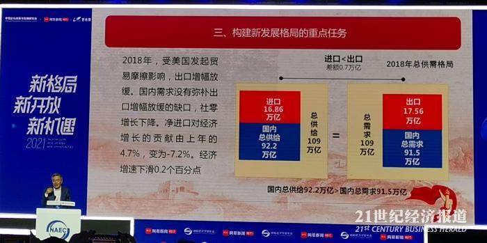 他介绍,从2017年投入产出表看,中国的总供需格局,即总供给和总需求是均衡的,都是97.2万亿元。但是细分看,国内总供给大于国内总需求,这个缺口就是进口和出口的差额。这种格局静态下是没有问题的,但如果出口增幅减缓,而国内需求没有填补这个缺口,就会出现产能过剩和经济增速下滑。