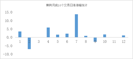 再和大家聊下每个月的什么时候更适合定投?先来说一个今年来比较明显的现象:A股月初大概率收涨的日历效应。可能盯盘比较久的小伙伴都会有一种感受,那就是A股今年来在月底和月初附近通常都有着比较好的胜率。这点我们也可以使用数据来进行简单的验证,我们使用横跨月底最后一个交易日的两周作为我们的观察窗口,统计自去年12月底以来近一年的上证指数的表现。如仅关注这10个交易日的涨跌幅我们可以发现,今年来其月度胜率达到75%,每个月度的涨幅平均值接近1.8%,大幅高于同期完整月度上证综指的50%月度胜率和0.88%的月度涨幅。