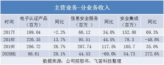 按产品类型划分,公司的主营业务分为电子认证产品、信息安全服务和安全集成。其中,电子认证产品的收入占比最高,报告期内占主营业务收入的比例在50%左右,信息安全服务的占比呈上升趋势,2019年的占比上升至35%;安全集成的收入占比呈下降趋势,2019年降至18%。