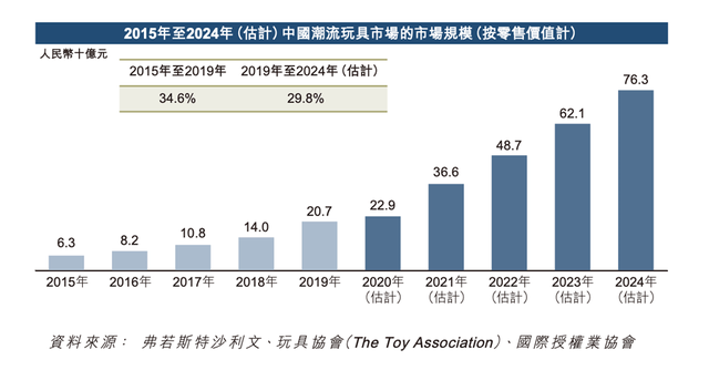 据弗若斯特沙利文报告数据显示,全球的潮流玩具市场从2015年的87亿美元增至2019年的198亿美元,预计2024年将达418亿美元。中国的潮玩市场从2015年的6.3亿元增加至2019年的207亿元,预计2024年将突破763亿元。