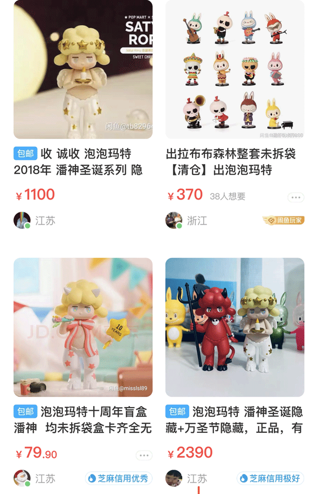 观潮新消费发现,原价59元的泡泡玛特潘神圣诞隐藏款,在闲鱼上售卖价高达2390元,还有不少千元求收;同样零售价59元的Molly胡桃夹子王子隐藏款,涨到1800元;原价699元的labubu大娃zimomo泰坦套装,甚至炒到42000元左右。