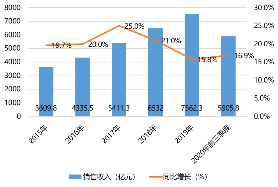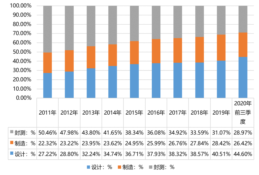 作为“新基建”的重要领域,工业互联网在中国加快发展,为集成电路产业带来新市场空间。2019年,在全球市场整体下降12个百分点的情况下,中国集成电路产业销售收入为7562.3亿元人民币,同比增长15.8%(数据来源:中国产业信息网、智研咨询)。2020年,新冠疫情冲击下,全球经济陷入了二战以来前所未有的衰落,但在政府的正确领导下,我国新冠疫情得到了有效控制,集成电路行业几乎没有太多受到疫情冲击。2020年前三季度,中国集成电路产业销售收入为5905.8亿元,同比增长16.9%。细分行业来看,2020年前三季度中国集成电路设计业销售收入为2634.2亿元,同比增长24.1%;集成电路晶圆制造业销售收入为1560.6亿元,同比增长18.2%;集成电路封测业销售收入为1711.0亿元,同比增长6.2%(数据来源:半导体协会、中商情报网)。
