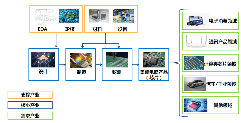从产业链视角分析,集成电路产业链包括原材料、设备、设计、制造和封测等五大部分。上游是集成电路设计环节,主要包括原材料硅片、设备、EDA(电子设计自动化)、IP核(知识产权核)等。中游主要是集成电子制造环节,属于资本和技术密集型产业。下游是封装测试环节,主要是将芯片封装在支撑物内,以增加防护并提供芯片和PCB(印制电路板)之间的互联。该环节技术含量最低,属于劳动密集型产业。随着产业分工高度专业化,集成电路产业各个环节之间的关联性、协同性要求越来越高,共同支撑整个产业稳步前进。