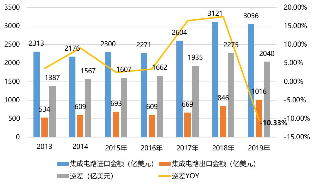 中国半导体芯片自给率较低,集成电路产业近年进出口逆差巨大,但降幅有所下降。我国集成电路市场需求接近全球总需求33%,但本土企业产值却不达7%,自给率尚不足22%,2019年我国集成电路行业进出口逆差达2040亿美元,但同比下降了10.3%,表明逆差幅度开始下降,未来中国集成电路产业的本土企业市场空间巨大(数据来源:开源证券)。