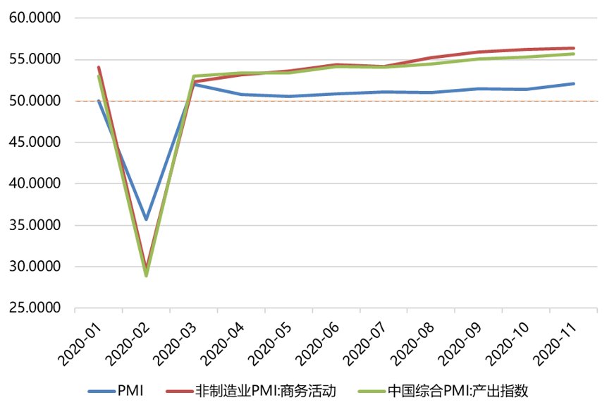 图4:中国制造业采购经理指数、非制造业商务活动指数和综合PMI产出指数