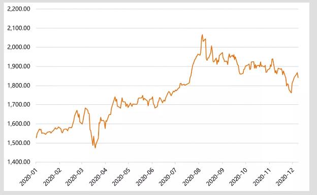 今年以来,随着疫情在全球扩散,经济下行压力不断增大,7月末至8月初,国际贵金属价格直线上行,国际金价一度突破2000美元/盎司,并持续打破历史高点。到了11月,形势直线反转,金价在11月27日承压大跌,最低触及1774美元/盎司,迅速跌破200日的强劲支撑。进入12月,黄金又开始触底反弹。12月3日,现货黄金收报1840.87美元/盎司,盘中最高触及1843.87美元/盎司(数据来源:腾讯财经)。“V”型反转的背后,投资者最关心的就是金价为何反复震荡、未来趋势如何?