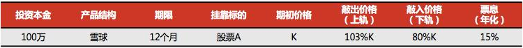 当然,真实的雪球结构产品,比上面这个例子要复杂得多。看这个项目真实产品里面,瓜农老李就是券商,小张就是投资者,“西瓜”就是“股票A”。敲出和敲入的价格设置为期初价格的103%和80%;“打赌”的收益率定的是15%。
