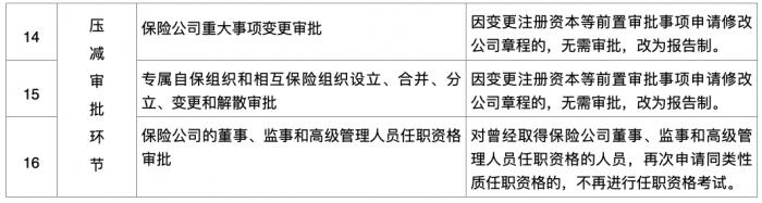 《通知》明确了银行业金融机构、非银金融机构等16项相关具体改革措施。具体来看,如中资银行业金融机构董事和高级管理人员任职资格核准,不再提供拟任人个人及其主要家庭成员的征信报告,改为申请人作出有关承诺;非银行金融机构董事和高级管理人员任职资格核准,不再提供拟任人及其配偶的个人征信报告,改为申请人作出有关承诺;除政策性保险公司董事、监事和高级管理人员任职资格审批以外的保险公司的董事、监事和高级管理人员任职资格审批,不再提供对拟任人的综合鉴定。