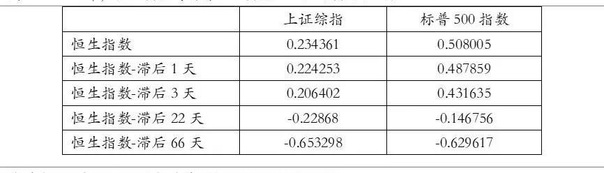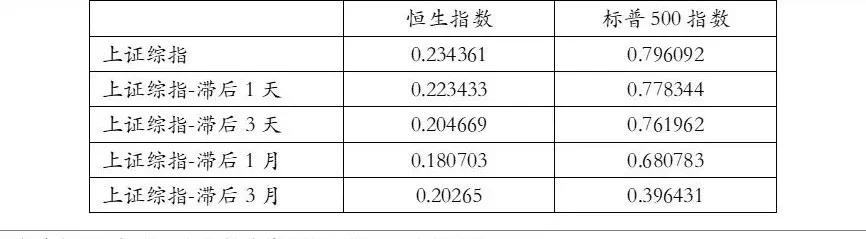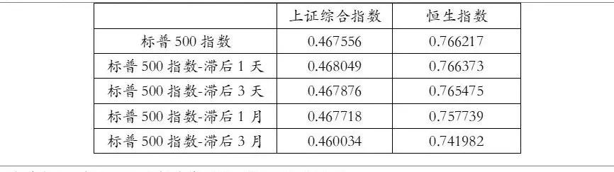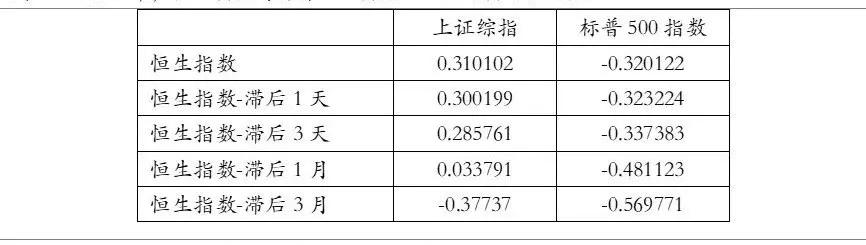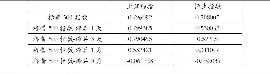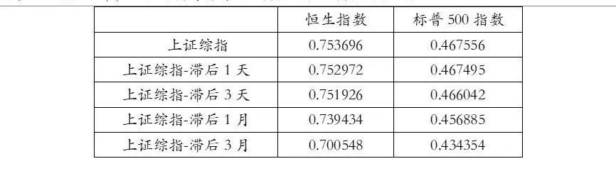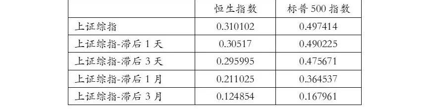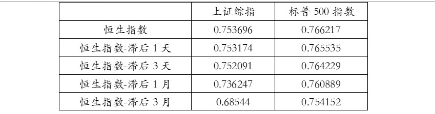 因为美国股市比中国大陆股市和香港股市晚开盘,这里存在时差的问题,同时为了研究三大指数间的具体传导顺序及影响的时间跨度,我们分别计算各指数同步、滞后1天、滞后3天、滞后1月、滞后3月对其他股指的相关性系数。