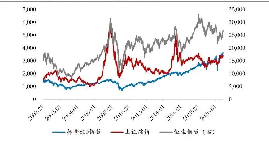 参照全球股票市场的重要性级别及我国投资者关注的热点,我们重点研究美国股票市场、中国股票市场和香港股票市场这三大市场。这里,我们以标普500指数、上证综指、恒生指数分别代表美股、A股、港股三大市场的走势,并分析它们过去20年走势之间的关联性。
