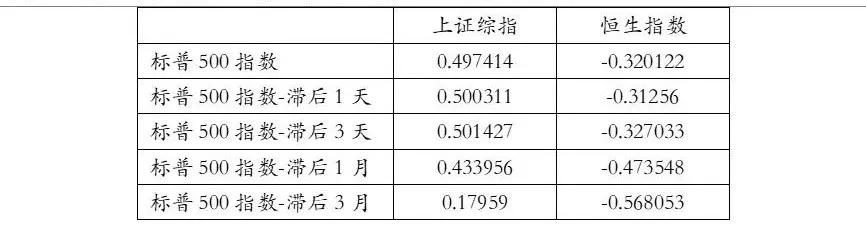 从数据结果来看:①标普500指数处于上行周期时,上证综指并不一定会跟随。②标普500指数处于下行周期时,上证综指与其强相关,且滞后1天的标普500指数与上证综指的相关性最强。