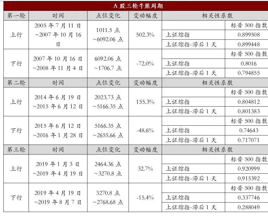 前文我们验证了美股、A股、港股之间存在一定的联动关系,这里面,美股往往是领先指标。为了更好地分析美股和A股之间的带动作用,我们单独选取了过往美股的三个牛熊周期及A股的三个牛熊周期,并计算这些时间段内两者间的相关性情况。