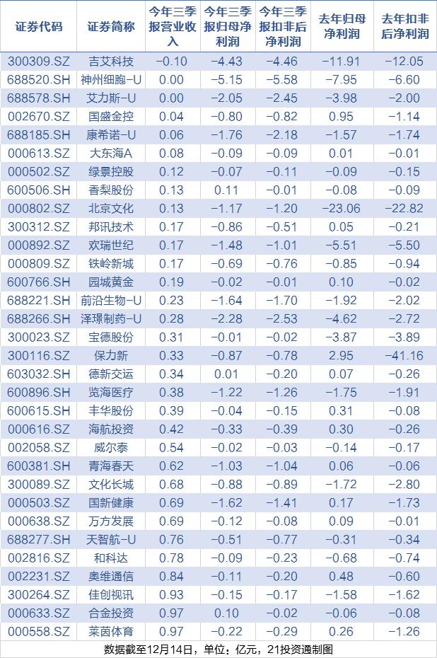根据“连续两年净利亏损(扣非前后)且营收低于1亿”的财务指标新规,21投资通筛选出32家非ST公司今年前三季度营收低于1亿元,且今年前三季度和去年扣非前或扣非后净利润均为负,包括北京文化(000802.SZ)、香梨股份(600506.SH)、 绿景控股( 000502.SZ)、吉艾科技(300309.SZ)等。