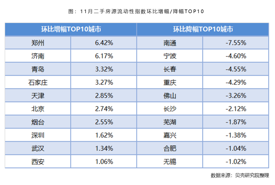 大部分城市房源流动性指数环比增加。贝壳研究院数据显示,11月二手房源流动性指数环比增加的城市有17城。一线城市除广州外,北京、深圳和上海房源活跃度均有所提升,11月北京二手房市场延续10月升温态势,流动性指数环比增加2.74%,处于下半年以来高位水平上;深圳“715”新政、“729”新政影响下房源流动性持续下调,近两月需求回温,房源活跃程度增加,11月二手房源流动性指数环比增加1.62%。二线城市郑州、济南、青岛、石家庄、武汉、西安等城市11月房源流动性水平提升,环比增幅在1%以上;而宁波、长春、重庆和长沙二手房交易活跃度有所下降,降幅在2%以上。三四线城市南通、佛山、芜湖、嘉兴等城市房源活跃度下降明显,其中南通环比降幅达7.55%。