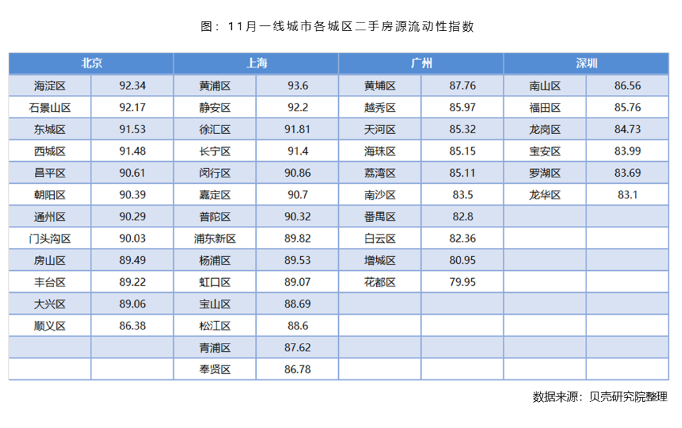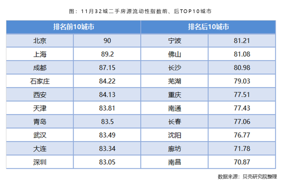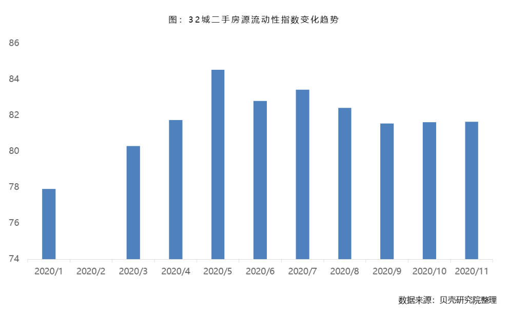 注:房源流动性指数是基于二手房成交周期和供需数据加权计算而来,经标准化后,取值限定在0-100。