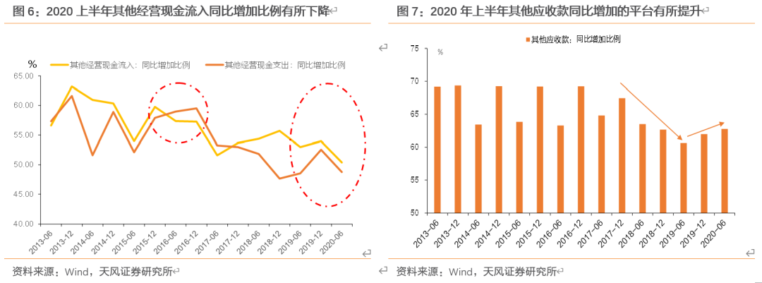 (2)进入 2020 年,由于受到疫情影响,地方政府公共财政预算受到明显冲击(税收下滑明显),财政承压之下对平台的回款也相应有所减少,对应可以看到 2020H1 其他经营现金流入同比增加的平台有明显减少,而其他应收款同比增加的平台有明显增加(一方面回款偏慢了,另一方面确实各地仍有投资建设发展的压力,支出有小幅上升)。这一趋势体现出尽管在当前防范化解地方政府隐性债务的大背景下,整体政策偏稳,但市场对于微观区域及主体进行筛选判断时,需进一步评估其地方政府财政的能力及其所面临的压力,意愿还需能力来落实。