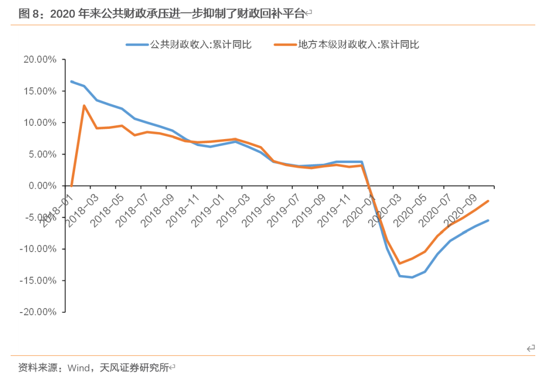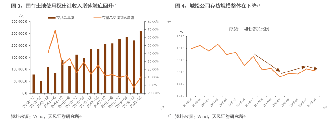 首先从资产端来看:(1)2020年受疫情冲击税收明显下滑,地方公共预算承压,年初疫情冲击下土地出让进度受到冲击,随着疫情得到控制,土地出让收入有所回升但累计仍明显低于去年,与此同时可以看到作为土地资产的主要记账科目“存货”在2020年上半年有明显增加:2020年上半年受疫情影响,逆周期叠加再融资边际宽松之下平台投资建设增多,叠加土地出让亦有所下滑,存货总规模增长较为明显,但对应看到存货同比增加的平台比例却在减少,一定程度反应了这其中的结构性分化。