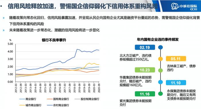 “尤为值得一提的是,近期以来,随着宏观政策逐步向常态化回归,企业再融资压力加大,信用风险爆发加速,并呈现从民企向国企蔓延的态势,需高度警惕国企信仰弱化背景下信用体系重构的风险。”毛振华称。