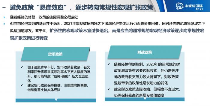 从短期来看,鉴于当前经济复苏的基础并不稳固,2021年宏观数据向好之下微观经济主体运行仍面临多重困难,同时还需防范政策退坡之下风险加速爆发,宏观政策尤需保持定力,扩张性的宏观政策不宜过快退出,而是应当将超常规的宏观经济政策逐步向常规性宏观扩张政策进行转变。