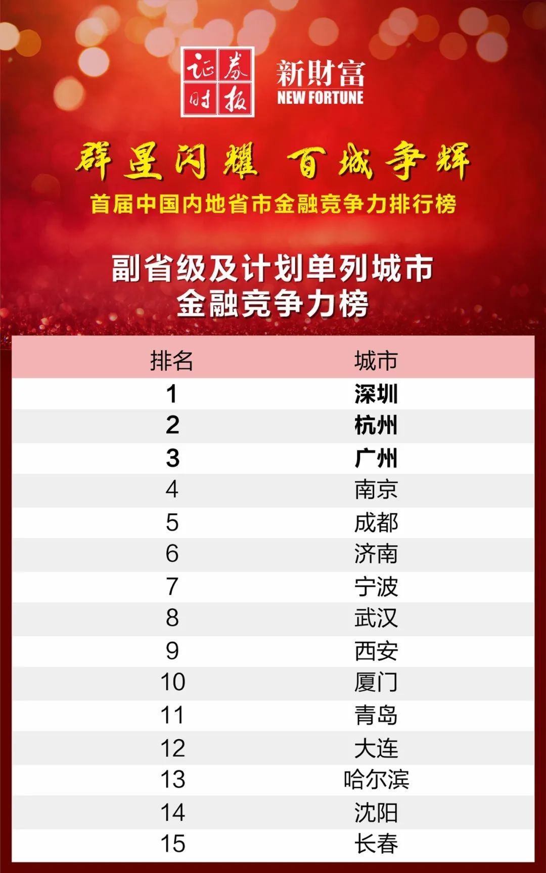 副省级及计划单列城市金融竞争力榜单中,深圳凭借多层次资本市场的优势遥遥领先,其次是杭州、广州,这三个城市的金融竞争力在全国主要城市中均处于较领先的地位。