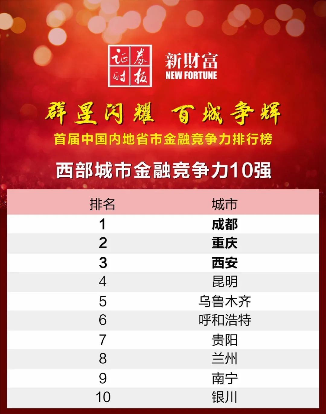 由12个省市及自治区构成的中国西部,也是中国经济不可或缺的重要力量。在西部城市金融竞争力榜单中,成都、重庆、西安为前三名。成都和重庆金融竞争力排名相差不大,在全国主要城市中排名分别为第8名、第10名。