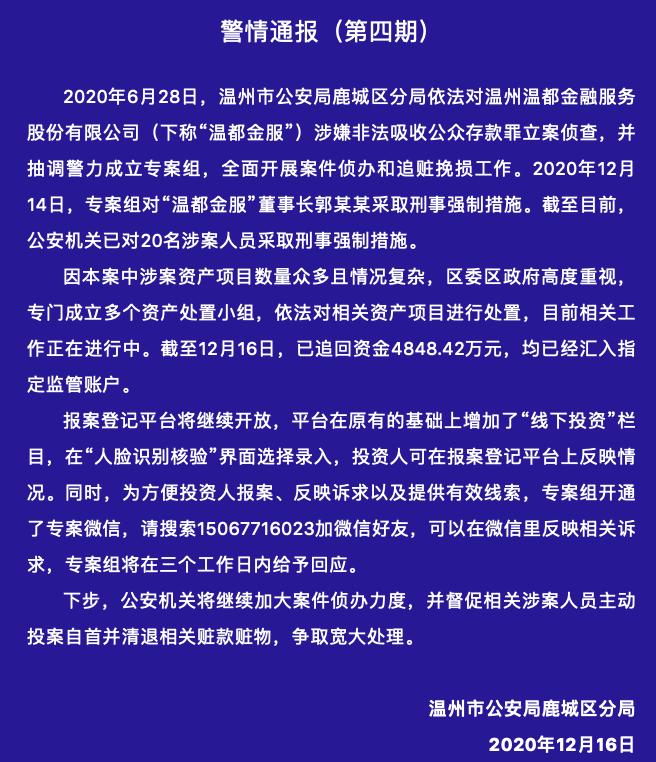 12月16日,温州市公安局鹿城区分局官方公号“平安鹿城”发布警情通报称,2020年6月28日,温州市公安局鹿城区分局依法对温州温都金融服务股份有限公司(下称“温都金服”)涉嫌非法吸收公众存款罪立案侦查,并将抽调警力成立专案组,全面开展案件侦办和追赃挽损工作。2020年12月14日,专案组对“温都金服”董事长郭某某采取刑事强制措施。截至目前,公安机关已对20名涉案人员采取刑事强制措施。