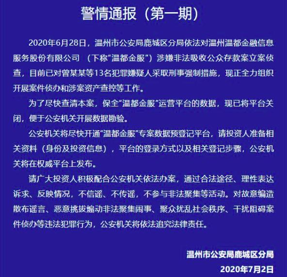 今年7月,“平安鹿城”曾发布警情通报称,2020年6月28日,温州市公安局鹿城区分局依法对温州温都金服涉嫌非法吸收公众存款案立案侦查,目前已对曾某某等13名犯罪嫌疑人采取刑事强制措施。