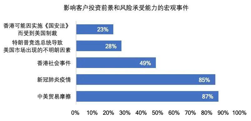 基于私人财富管理公会成员调查,近九成的客户因中美贸易摩擦和新冠肺炎疫情对投资前景的担忧、并在投资上受到影响,略小于一半客户认为香港社会事件对其投资活动造成深远的影响。