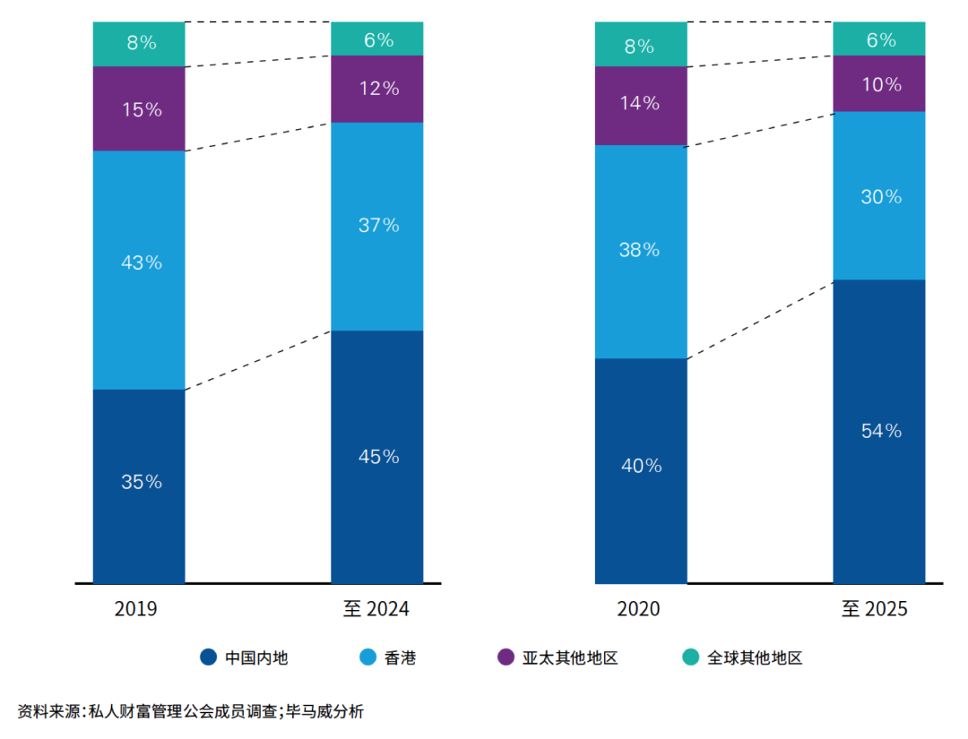 截至统计时,2020年香港私人财富管理行业资产管理规模来源中,有四成来自中国大陆。到2025年,这一占比预计将超过一半提高至54%。