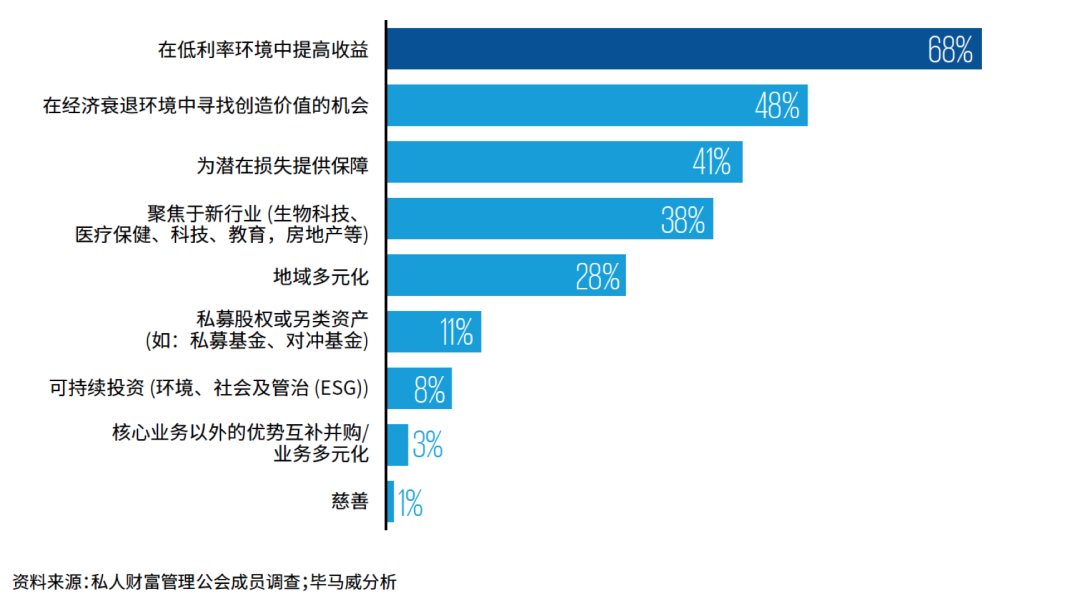 此外,客户在投资战略和投资目标上发生了一些变化。其中超过三分之二的客户把在低利率环境中提高收益作为他们最重要的投资目标(68%),近一半的客户在投资时关注在经济衰退环境中寻找创造价值的机会(48%),以及为潜在的损失提供保障(41%)。