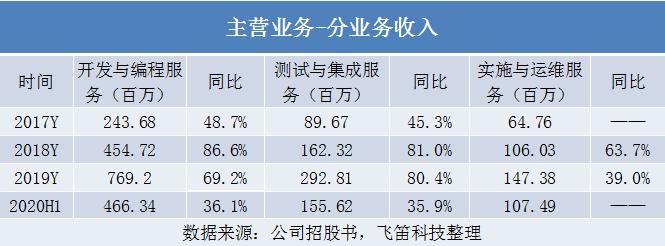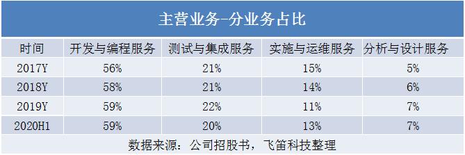 分业务来看,公司业务覆盖软件项目整个生命周期,具体包括分析与设计服务、开发与编程服务、测试与集成服务、实施与运维服务等。其中,分析与设计服务为软件全生命周期的早期阶段;开发与编程服务、测试与集成服务为软件开发的具体实施阶段;实施与运维服务是对软件信息产品开发完成后的后续运行维护和支持等。