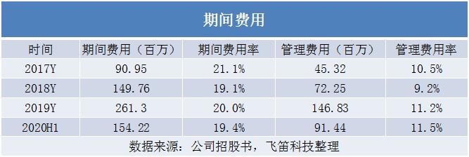 期间费用中,比重较大的管理费用,报告期内,公司的管理费用分别为4532万元、7225万元、1.47亿元和9144万元,管理费用率分别为10.5%、9.2%、11.2%和11.5%,管理费用率呈上升趋势,公司解释,主要是业务规模的增长导致相应的管理及平台人员增加,员工薪酬增加。