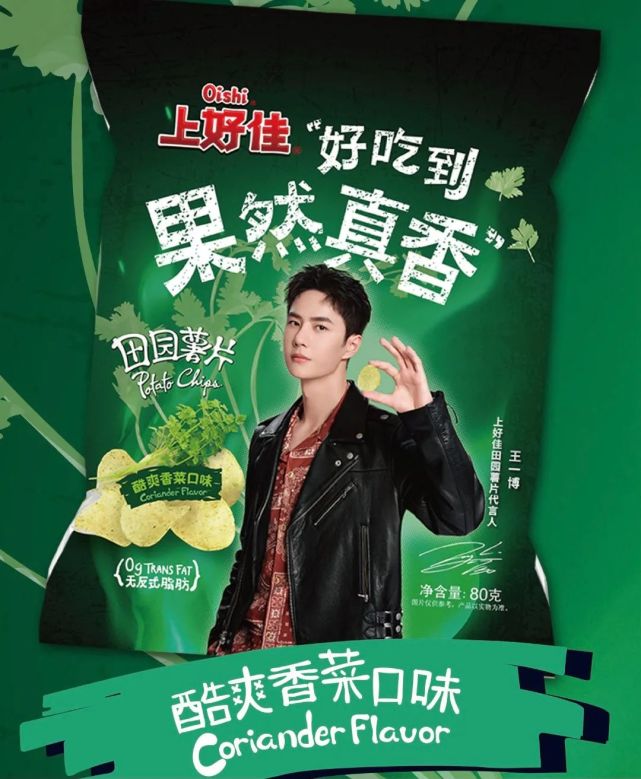11月,上好佳官方微博也宣布推出酷爽香菜味的田园薯片,田园薯片系列的代言人也是酷爱吃香菜的王一博,购买这款“王之香菜”薯片组合,粉丝还有机会获得王一博卡片。