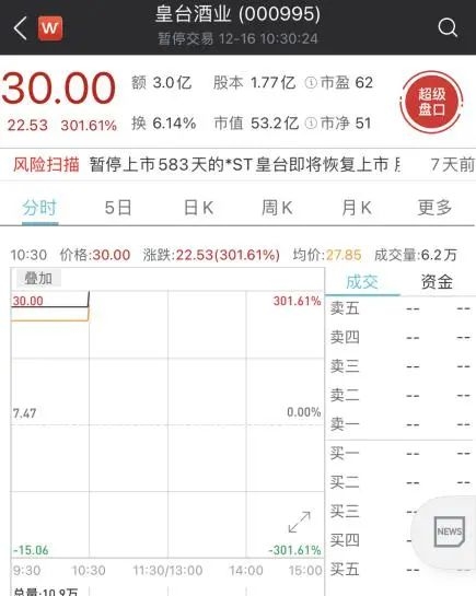 “消失”一年半后 ,有着“西北茅台”之称的*ST皇台(000955)成功摘帽,变更为“皇台酒业”,并恢复交易。今日开盘,皇台酒业股价暴涨234.7%,持续拉升大涨268%后,因触发涨停限制,盘中被两次临时停牌。截至发稿,皇台酒业股价报30元/股,大涨301.61%,成交额超3亿元。