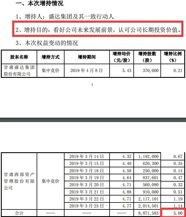 4月8日,皇台酒业称接到盛达集团通知,后者与其一致行动人甘肃西部资产管理股份有限公司通过深交所买入公司股票达5%。盛达集团当时给出的增持目的是:看好公司未来发展前景,认可公司长期投资价值。