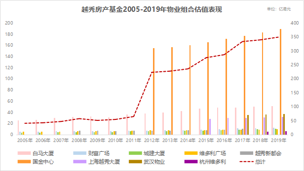 就下表的估值数据看,2012年,越秀地产旗下优质商业项目广州国际金融中心注入越秀房产基金,该年越秀房产基金在管物业规模和估值直接跃升至200亿阶梯,实现跨越式成长。