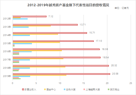 自注入广州国金中心资产,过去7年时间,越秀房产基金的物业经营总收入从7亿港元到2019年的20.58亿港元,年复合增长率16.37%,国金中心的营收则从2012年的1.7亿港元迅速增长至11.33亿港元,年复合增长率达到31.12%。