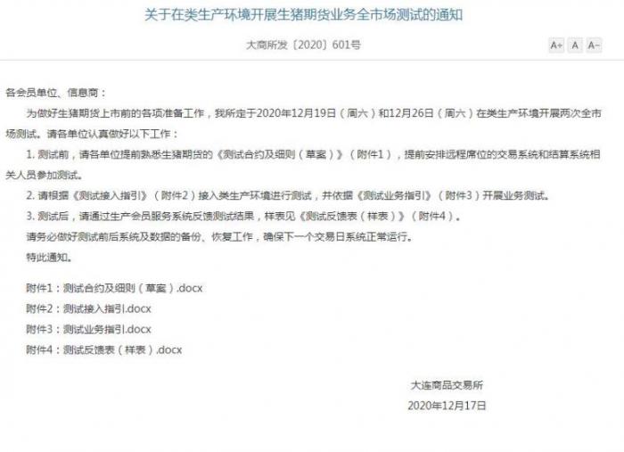 12月17日,大商所发布《关于在类生产环境开展生猪期货业务全市场测试的通知》,为做好生猪期货上市前的各项准备工作,定于12月19日(周六)和12月26日(周六)在类生产环境开展两次全市场测试。