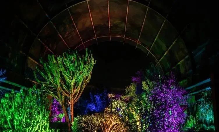 艺术家Klip Collective和他的团队为这个植物园开启了夜间展览,将仙人掌与花花草草用投影的动态光线画面与音乐联动,创造了一场沙漠植物园中的沉浸式之旅。