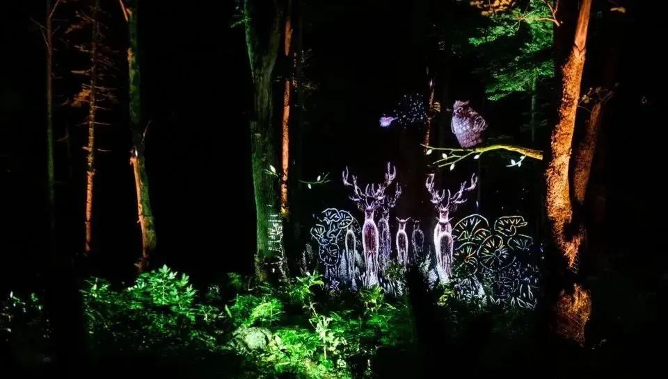通过全息投影技术、互动装置等,在树林中将诸鸟类和鹿之类的动物投影在森林之中,还原出原本充满生机的森林的样子。