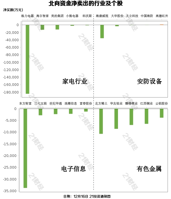 北向资金减持了21个行业,其中家电行业最多,净卖出金额达20.25亿元,其次是安防设备行业,净卖出3.86亿元。