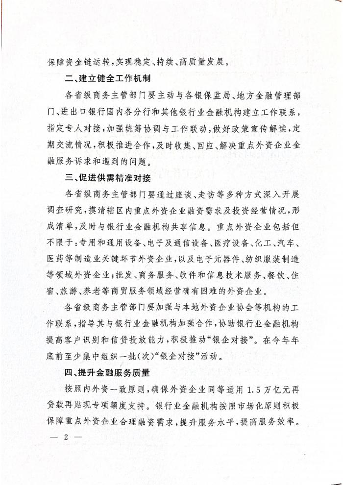 《通知》要求,各地要建立健全工作机制,强化工作联动,及时、全面了解重点外资企业融资需求及投资经营情况,举办“银企对接”活动,促进供需精准对接,提升金融服务质量。