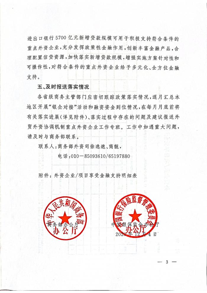 12月10日,商务部办公厅、银保监会办公厅联合印发《关于贯彻落实国务院部署给予重点外资企业金融支持有关工作的通知》,指导各地商务主管部门和银保监局做好《国务院办公厅关于进一步做好稳外贸稳外资工作的意见》(国办发〔2020〕28号)落实工作,加大对重点外资企业金融支持力度。