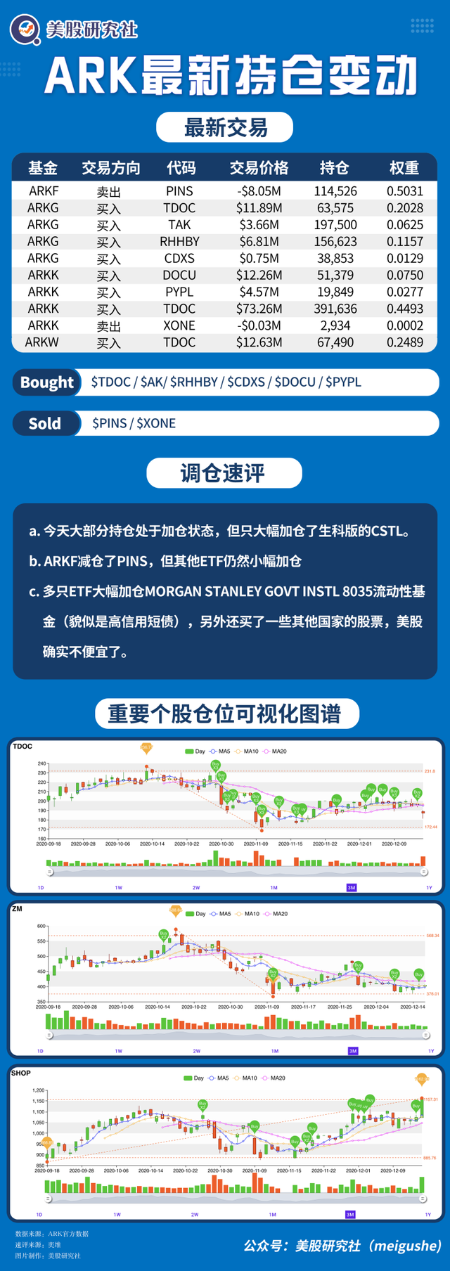 由于ARK基金管理的ETF的业绩非常出色,ARK会公布每日持仓动作。12月17日,美股研究社整理该基金持仓整理如下: