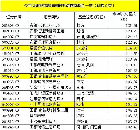 而由孙迪和郑澄然管理的广发高端制造目前以124.46%暂列第三。此外,赵诣管理的农银汇理研究精选、诺德罗世锋管理的诺德价值优势和诺德周期策略、以及工银瑞信中小盘成长、工银战略新兴产业A的收益率超过110%。